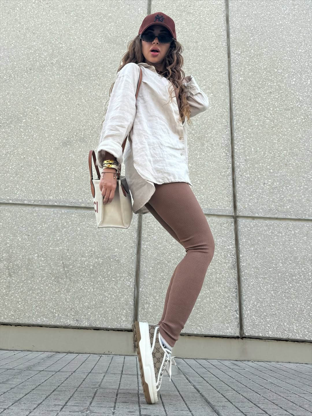 وأطلّت الفنانة اللبنانية في الصور وهي تقف على أطراف أصابع قدميها بحذاء رياضي خفيف، نسّقته مع ملابس شتوية مريحة عبارة عن “ليغنغ” باللون البنّي، وتوب بنّية وقميص أبيض فضفاض، وحملت على كتفها حقيبة بيضاء متوسطة الحجم وبتصميم كلاسيكي من “غوتشي” (Gucci).