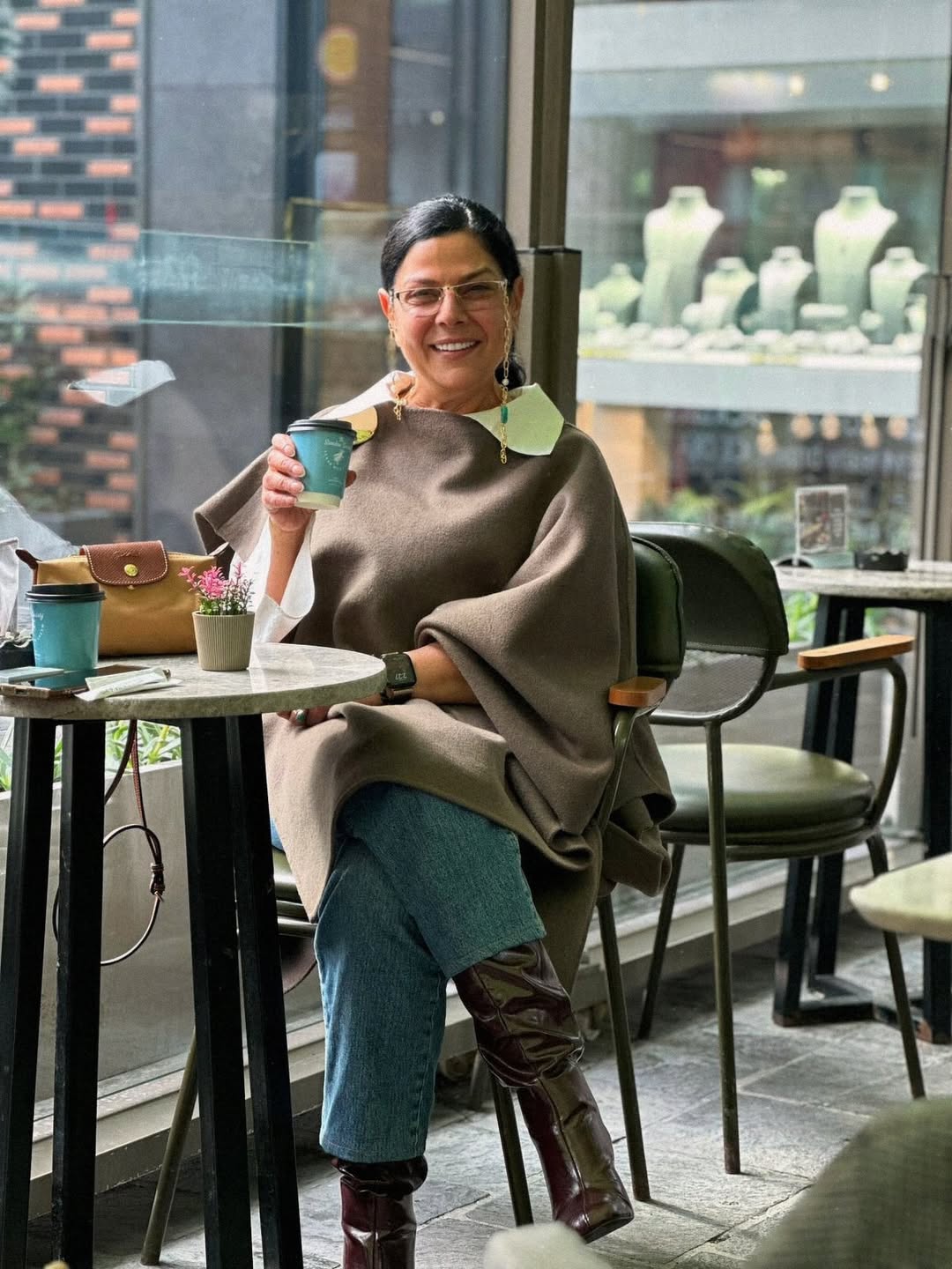 واختارت النجمة السورية إطلالة خريفية أنيقة، عبارة عن جينز وقميص بتصميم كلاسيكي ونسّقت فوقه “كاب” باللون الرمادي وبوط من الجلد باللون البنّي اللامع بتصميم أنيق. ونسقت إطلالتها الرقيقة بإكسسوارات رقيقة مع سلسلة بارزة موصولة بنظّاراتها الطبية.