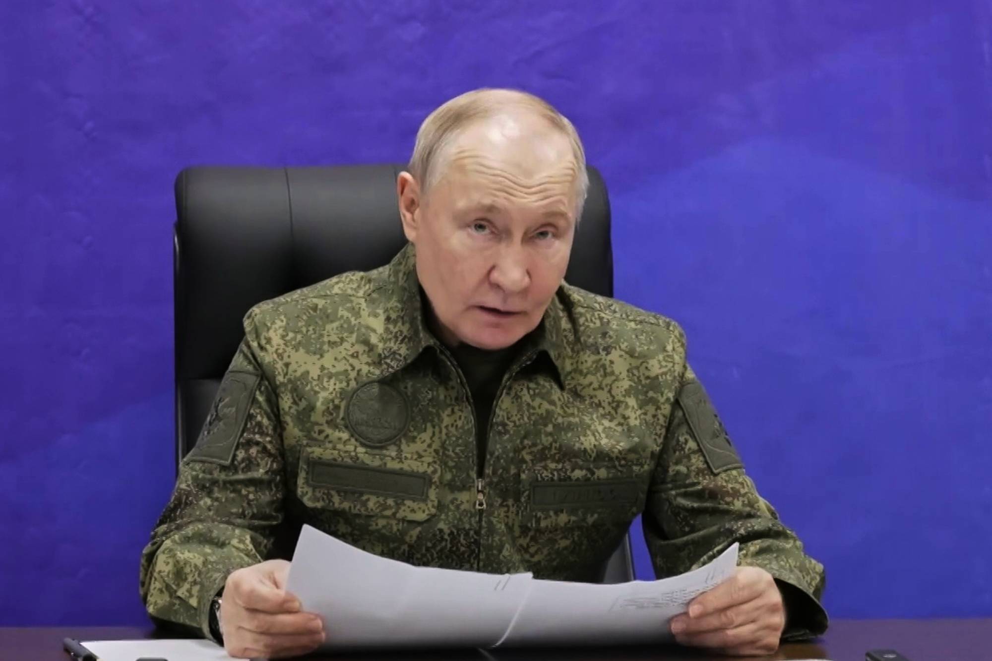 الرئيس الروسي فلاديمير بوتين يتحدث خلال زيارته مقراً قيادياً لقوات بلاده في مكان لم يتم الكشف عنه الاثنين (أ.ب)